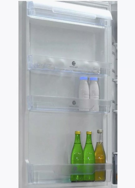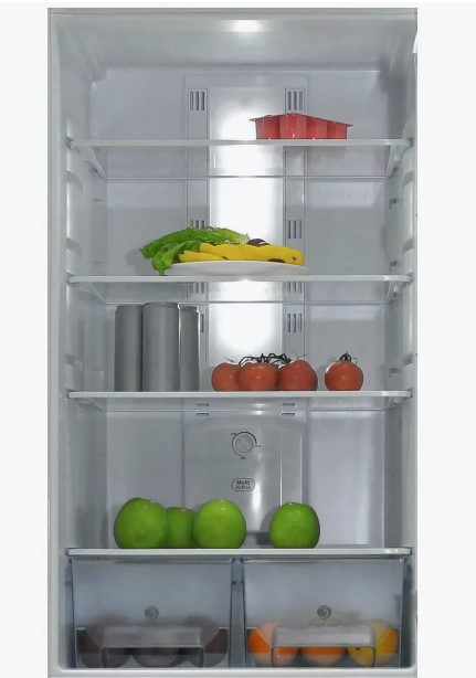 Корпус холодильника изготовлен из окрашенного металла и установлен на регулируемые по высоте ножки. В верхнем холодильном отделении расположены 4 стеклянные полки и 2 прозрачных пластиковых контейнера для овощей и фруктов. Нижнее морозильное отделение оснащено 4 вместительными пластиковыми корзинами, одна из которых имеет уменьшенный объем, а другая – увеличенный (Big box). Двери морозильной и холодильной камер оборудованы правыми петлями и интегрированными в торцы ручками. В двери холодильной камеры размещены 4 съемные полки-барьеры.