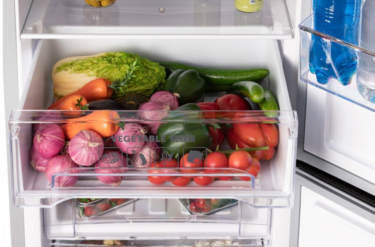 Внутренняя посуда холодильника имеет красивый серебристый отлив и инфографику на ящиках и дверных полках.