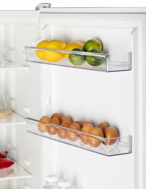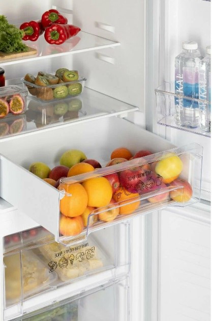 Внутреннее пространство продумано для комфорта: четыре полки из закалённого стекла регулируются по высоте и выдерживают значительную нагрузку, большой выдвижной ящик поддерживает оптимальный микроклимат для овощей и фруктов, а дверцы оснащены тремя полками. LED-подсветка обеспечивает удобный обзор, а съёмный уплотнитель и возможность перенавешивания дверей упрощают уход за техникой и адаптацию под планировку кухни.