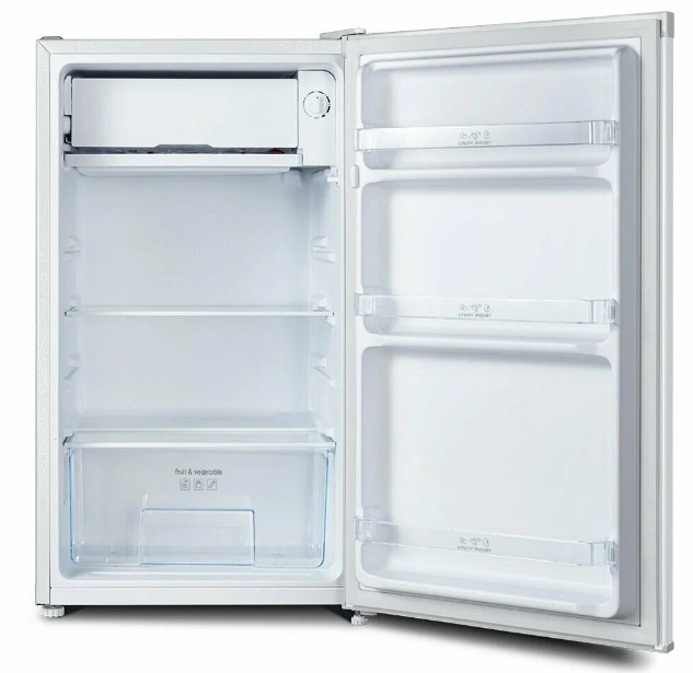 Внутри холодильника одна полка из закаленного стекла. Три полки на дверце холодильника предусмотрены для бутылок, соусов, яиц и герметичных упаковок с сырами, йогуртами. Кроме того, есть отделение для овощей и фруктов с крышкой полкой.