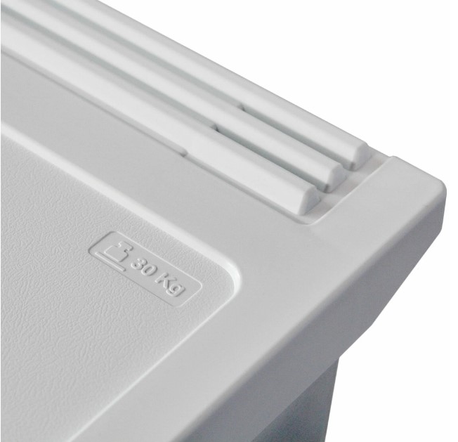 Полезное пространство объёмом 100 литров организовано максимально рационально. Внутри установлены три полки из стекла и пластика, выдерживающие до 40 кг каждая — на них удобно размещать кастрюли, банки, контейнеры с готовыми блюдами и упаковки с продуктами на неделю. Нижний ящик предназначен для овощей и фруктов: например, в нём поместятся несколько кабачков, пучки зелени, головки капусты или пара килограммов яблок. Это позволяет сохранить порядок и дольше поддерживать свежесть продуктов.