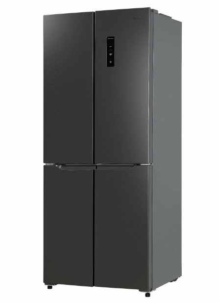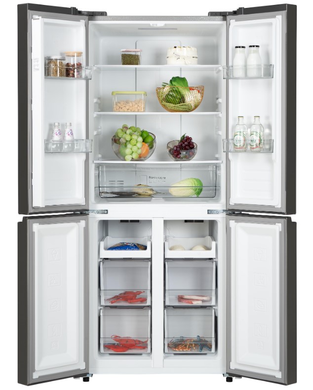 Холодильник оснащен четырьмя дверями и тремя камерами, что позволяет удобно разместить продукты и обеспечивает быстрый доступ к ним. В холодильном отделении имеется 3 полки из стекла и пластика, а в морозильном - 6 ящиков и полок.