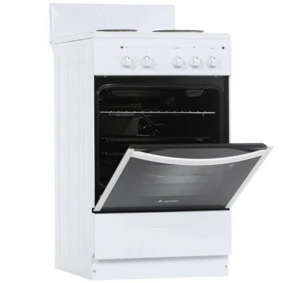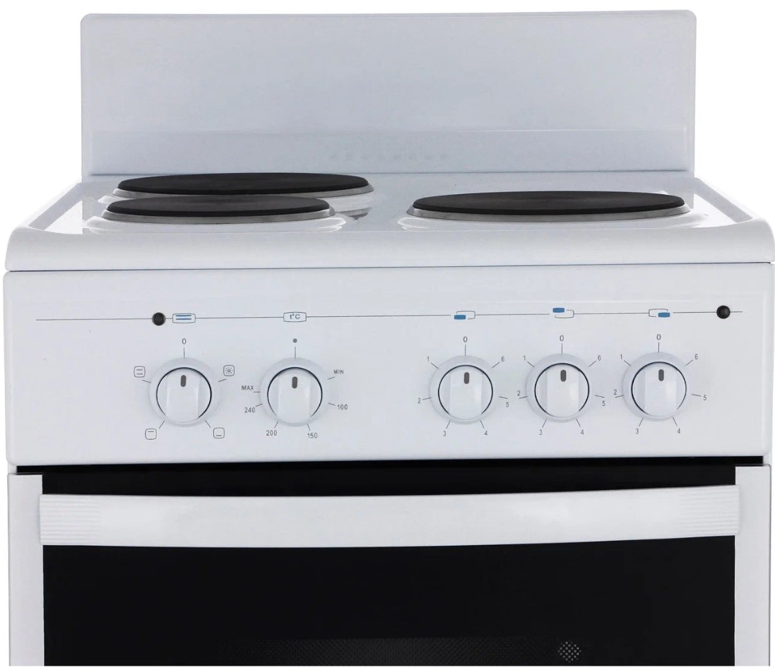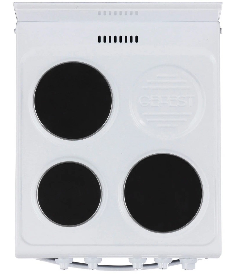 мощность каждой конфорки.: 1 кВт (передняя левая), 1.5 кВт (передняя правая), 1.5 кВт (задняя левая); подсветка духовки одинарная, штампованные направляющие духовки, фасад: эмалированный, класс электробезопасности: I, габаритные размеры в упаковке ШхГхВ: 55.6x70x96.4 см, масса с упаковкой: 42.4 кг, масса без упаковки: 37.9 кг; комплектация: решетка , 2 противня , документация , розетка, ножки регулировочные