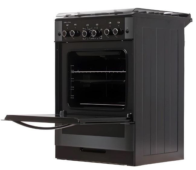 Газовая плита оборудована газовой духовкой объемом 52 литра. Духовка оснащена функцией газ-контроля, которая обеспечивает безопасность при использовании. В духовке есть вертел с электроприводом, а также съемные проволочные направляющие.
