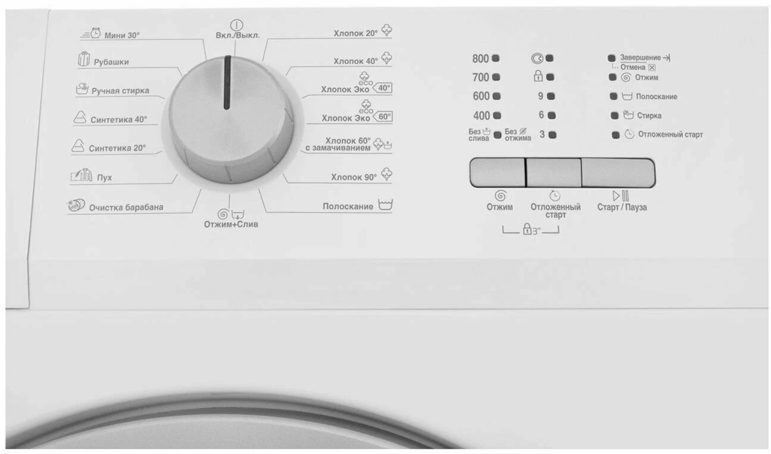 блокировка управления, выбор скорости отжима, отсрочка старта, старт/пауза