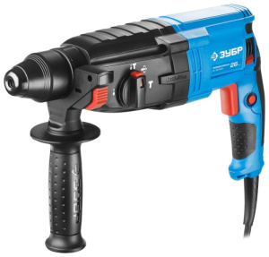 Перфоратор Зубр ЗП-26-800 поможет выполнить широкий спектр работ. Он может использоваться для обычного сверления, с ударом, долбления стен. Крепление бура – SDS-Plus. Мощность модели составляет 800 Вт, чего хватит для полноценной работы с оборудованием.