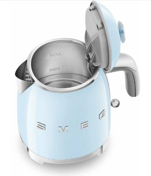 Бренд: Smeg - итальянский производитель бытовой техники, известный своими стильными и функциональными приборами. Этот чайник выполнен в пастельно-голубом цвете, который напоминает стиль 50-х годов. Объем чайника 0,8 литра, что позволяет приготовить до трех чашек чая или кофе за раз. Номинальная мощность 1400 Вт обеспечивает быстрое кипячение воды. Внутренняя часть изготовлена из нержавеющей стали для надежности и долговечности, а корпус из пластика для легкости и удобства.