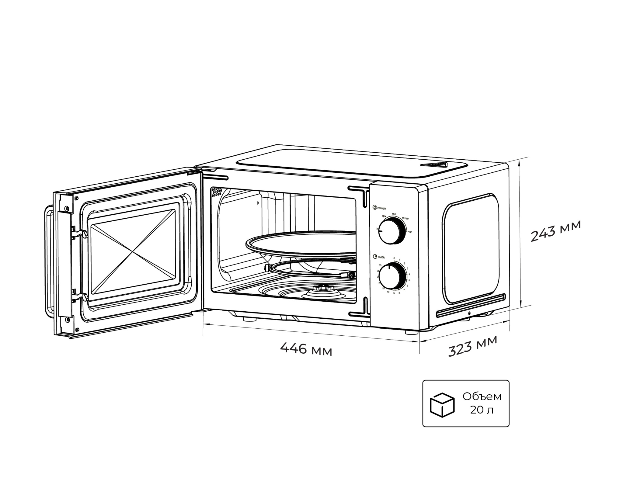 Стеклянное вращающееся блюдо диаметром 24,5 см обеспечивает максимально равномерное приготовление блюд.