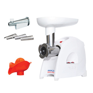Извлечь те части, которые не поддались перемолу, легко с функцией реверса. В комплекте к Аксион М 41.04 идет целый набор насадок, которые значительно расширят функционал устройства и разнообразят ваш ежедневный рацион: насадка для приготовления колбас, для кеббе, а также соковыжималка. Все насадки, как и шнур, можно хранить в специальных отсеках, что весьма удобно. Прорезиненные ножки добавят прибору устойчивости в процессе работы.
