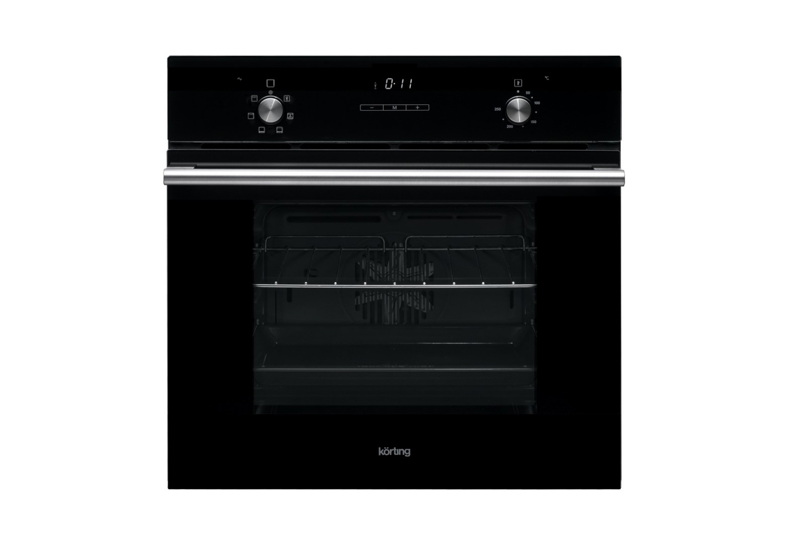 Управление осуществляется утапливаемыми поворотными регуляторами и LED‑дисплеем Cold White с электронным таймером, что упрощает выбор режима и времени и облегчает очистку панели. Внутри предусмотрены лампа накаливания и конвекционный вентилятор, обеспечивающие хороший обзор блюда и равномерное распределение тепла.