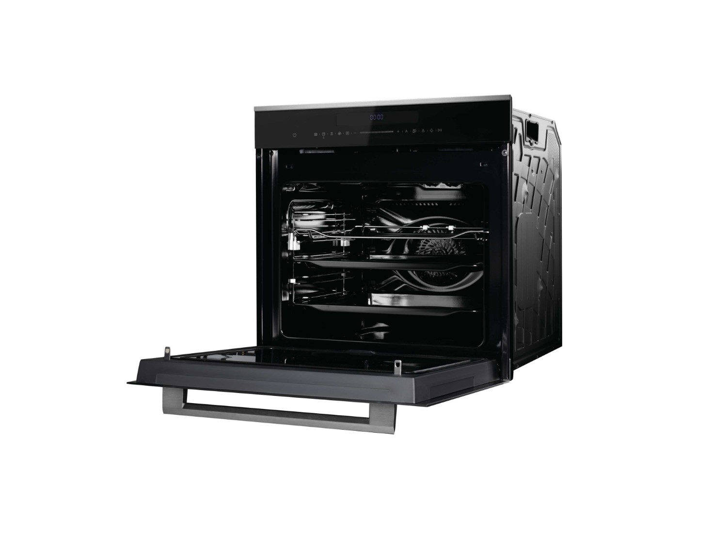 Управление полностью сенсорное, все параметры выводятся на крупный белый LED‑дисплей; предусмотрен электронный таймер с отложенным стартом и автоотключением. Внутри — LED‑подсветка, конвекционный вентилятор и система автоматического охлаждения, снижающая нагрев боковых стенок и фасада мебели.