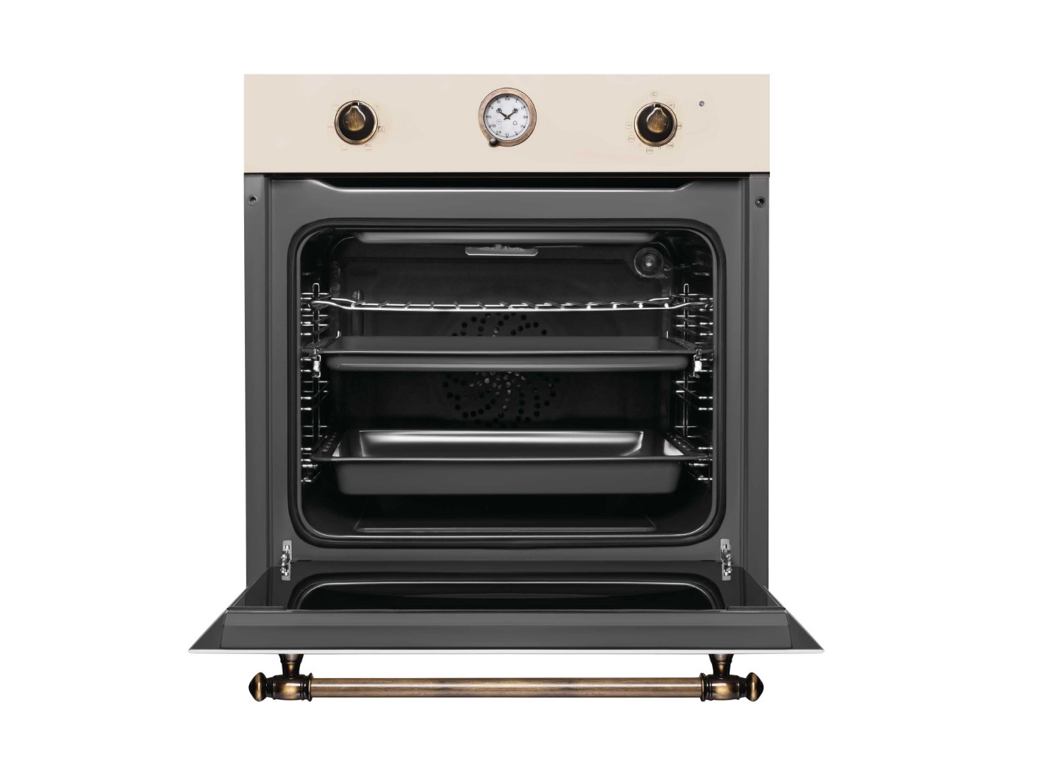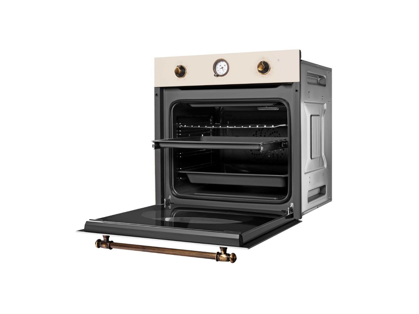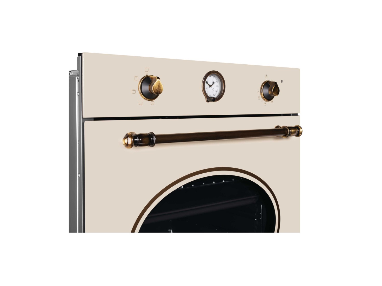 Шкаф относится к коллекции Provence: фасад цвета «слоновая кость» дополнен бронзовой ручкой, поворотными регуляторами и аналоговыми часами, создающими классический ретро‑образ. Габариты корпуса около 59,5×59,5×58 см, объем камеры 64 л (часть продавцов указывает до 73 л), встраивание — ниша примерно 60×56×56 см.