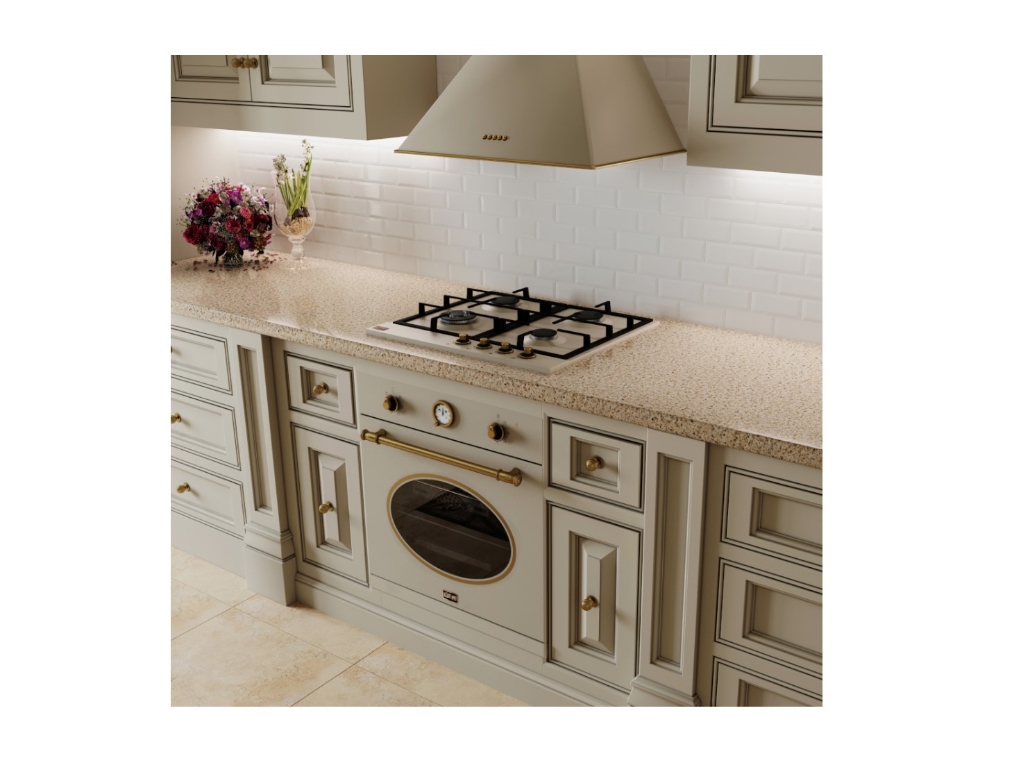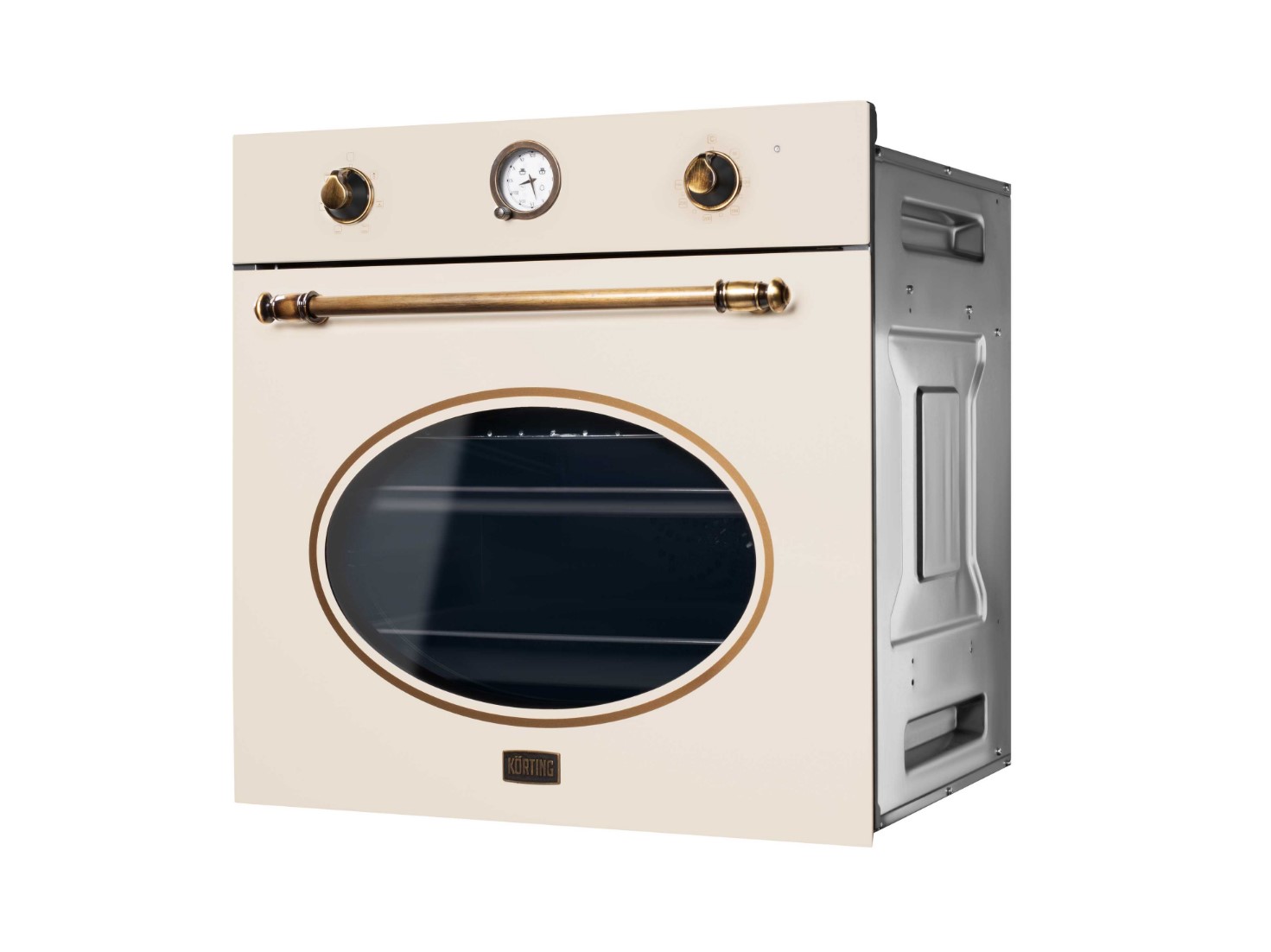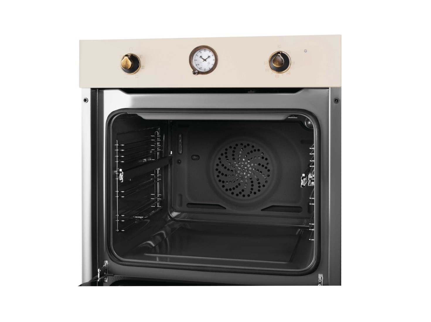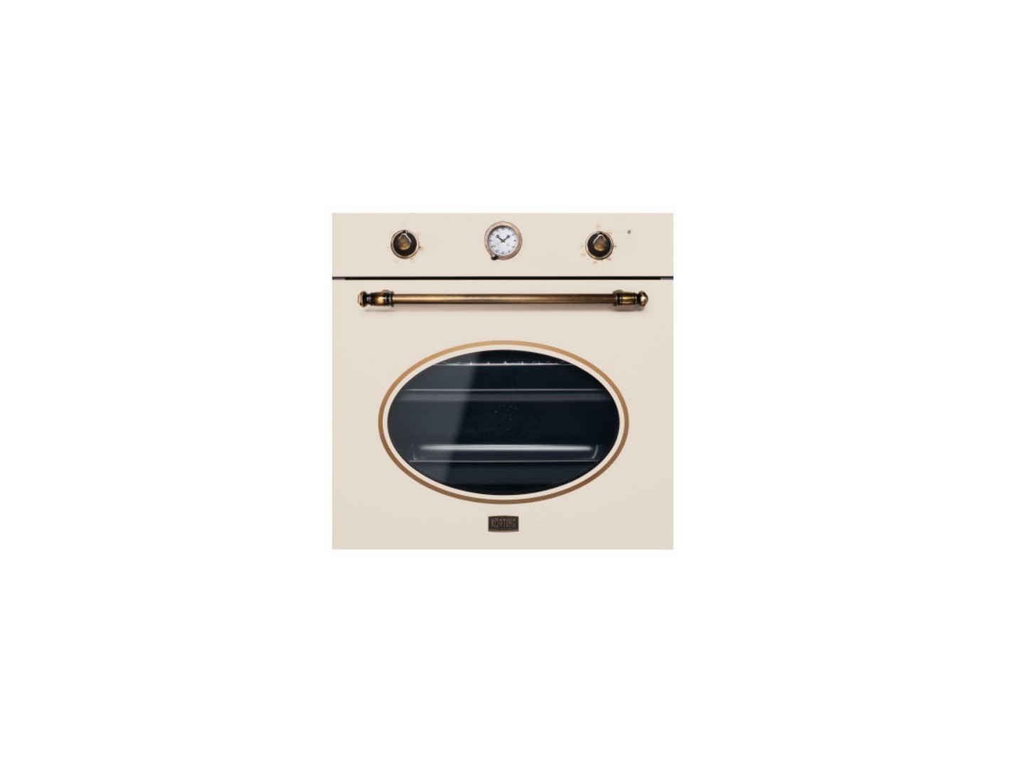 Шкаф относится к коллекции Provence: фасад цвета «слоновая кость» дополнен бронзовой ручкой, поворотными регуляторами и аналоговыми часами, создающими классический ретро‑образ. Габариты корпуса около 59,5×59,5×58 см, объем камеры 64 л (часть продавцов указывает до 73 л), встраивание — ниша примерно 60×56×56 см.