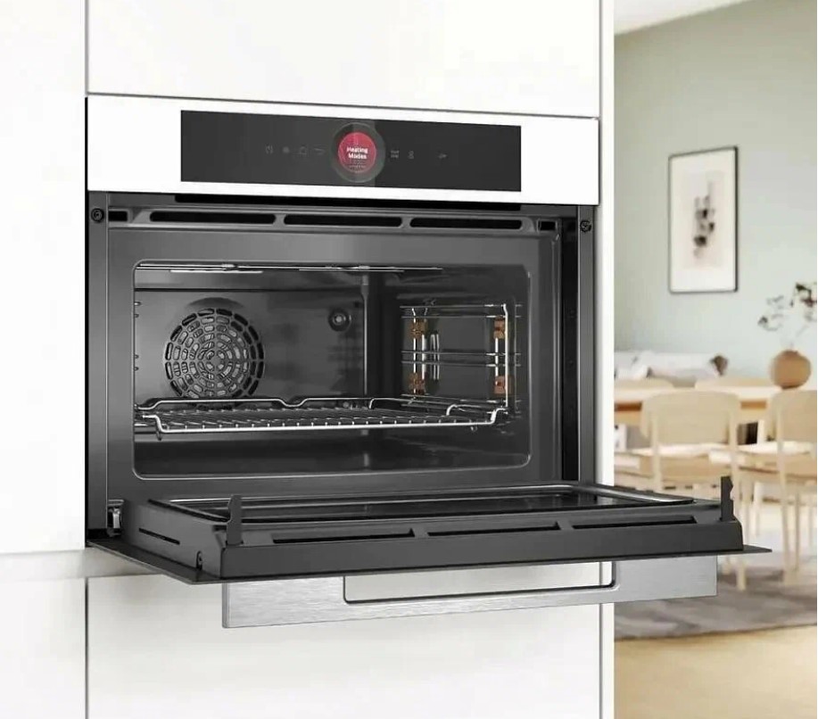 Духовой шкаф Bosch CMG7241W1 - это высококачественный прибор, который сочетает в себе элегантный дизайн и продуманные функции. Управление прибором осуществляется с помощью сенсорных элементов и 2.5-дюймового цветного TFT-дисплея, который обеспечивает простоту и удобство использования. Шкаф оборудован электронными часами и таймером, что позволяет контролировать процесс приготовления блюд и избегать пережаривания. Система Home Connect дает возможность управлять прибором дистанционно через смартфон или планшет, что добавляет удобства в использовании. Духовой шкаф Bosch CMG7241W1 оснащен десятью режимами нагрева, включая верхний/нижний жар, большой и малый гриль, гриль с конвекцией, нижний жар, подогрев посуды, размораживание и автоматический быстрый разогрев. Это позволяет приготовить практически любое блюдо, от классической пиццы до изысканного десерта. Внутреннее LED-освещение обеспечивает хороший обзор процесса приготовления пищи. Дверца шкафа откидная, с амортизатором SoftClose, что обеспечивает мягкое и плавное закрытие. Трехслойное остекление дверцы и система охлаждения прибора предотвращают перегрев и гарантируют безопасность использования. Блокировка от детей защищает от случайного включения или изменения режимов работы. В комплекте с шкафом идут комбинированная решетка и универсальный противень.