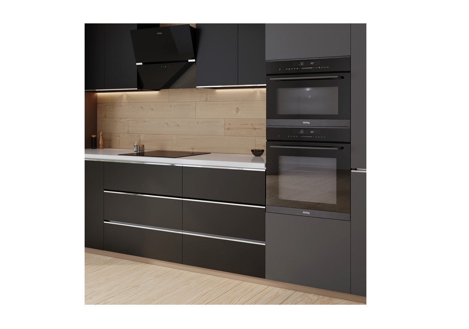 Для современных кухонь с черной техникой (Black glass), где важен единый визуальный ряд с варочной поверхностью и вытяжкой в черном стекле.