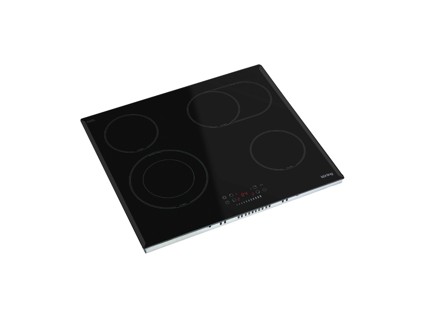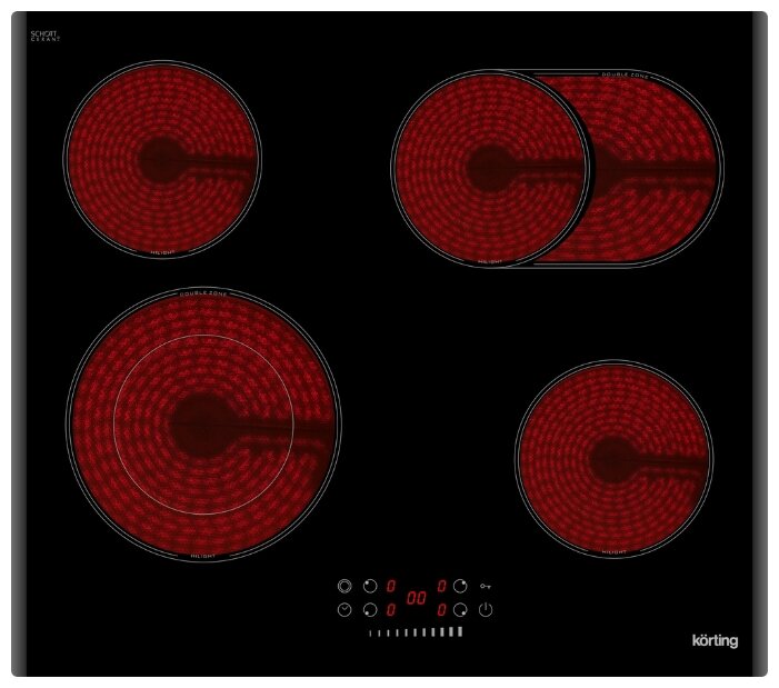 Панель оснащена четырьмя HiLight‑конфорками с девятью ступенями нагрева, одна из которых — трёхконтурная круглая, а другая — двухконтурная овальная зона расширения.