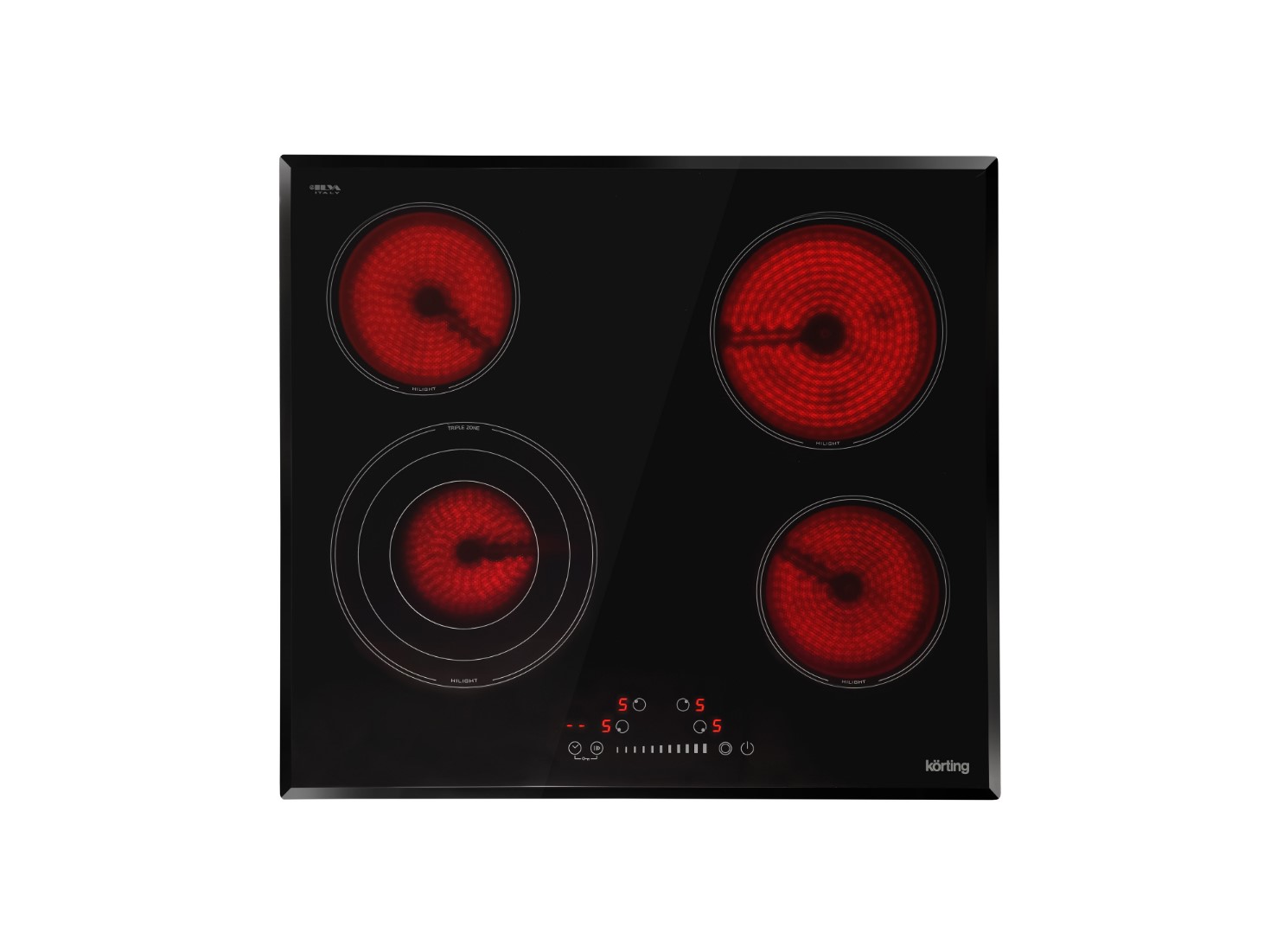 Материал поверхности — стеклокерамика, что упрощает уход и визуально сочетается с черной встроенной техникой Korting.