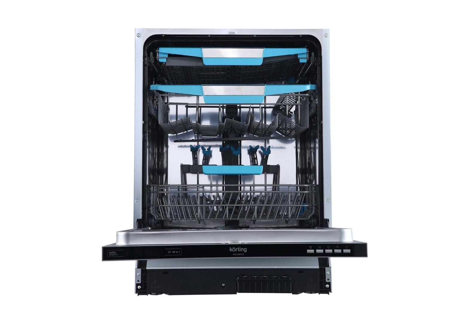 Три корзины позволяют удобно разместить до 14 комплектов посуды, включая противни и крупные кастрюли, а отдельная третья корзина и держатель до 6 бокалов упрощают размещение столовых приборов и стекла.