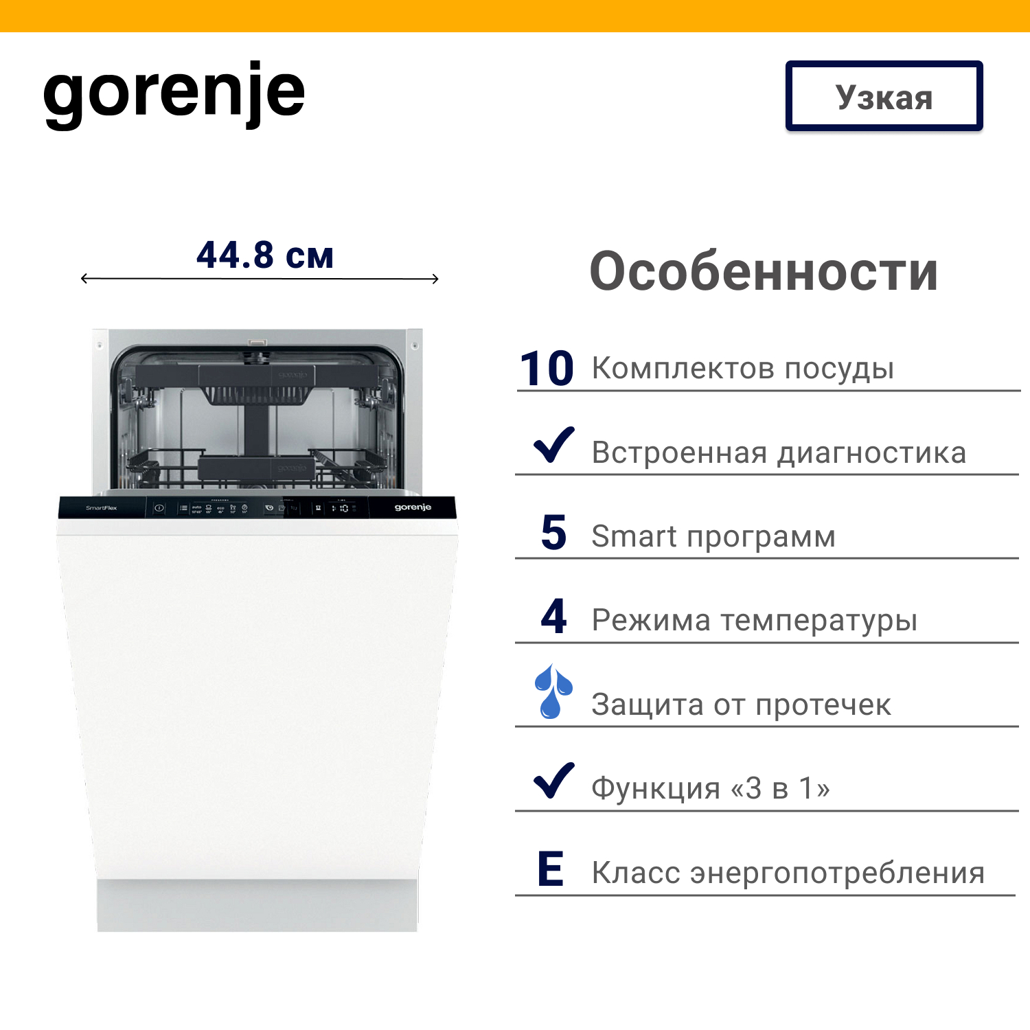 Встраиваемая посудомоечная машина Горенье GV561D11 работает в нескольких температурных режимах (от 45°C до 65°C). Выбирайте наиболее подходящий. Имеется девять встроенных программ. Эко очень экономичен, прибор не тратит много воды и электроэнергии. Однако, при этом, он работает дольше. Интенсивную мойку удобно использовать для сковородок и кастрюль. Имеется отдельный режим для хрупкой стеклянной посуды и бокалов.