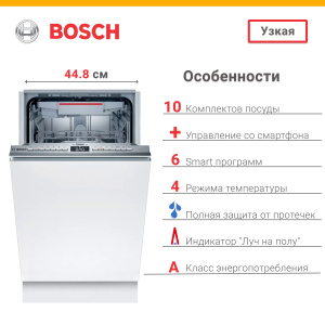 Техника оснащена шестью стандартными программами, включая автоматическую, экономичную, интенсивную и ночную, что позволяет выбрать наиболее подходящий режим в зависимости от загрузки и степени загрязнения посуды.