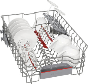 Вместительность машины составляет 10 комплектов посуды, которые удобно размещаются на трех корзинах. Верхний короб можно переставлять по высоте в зависимости от размера посуды.
