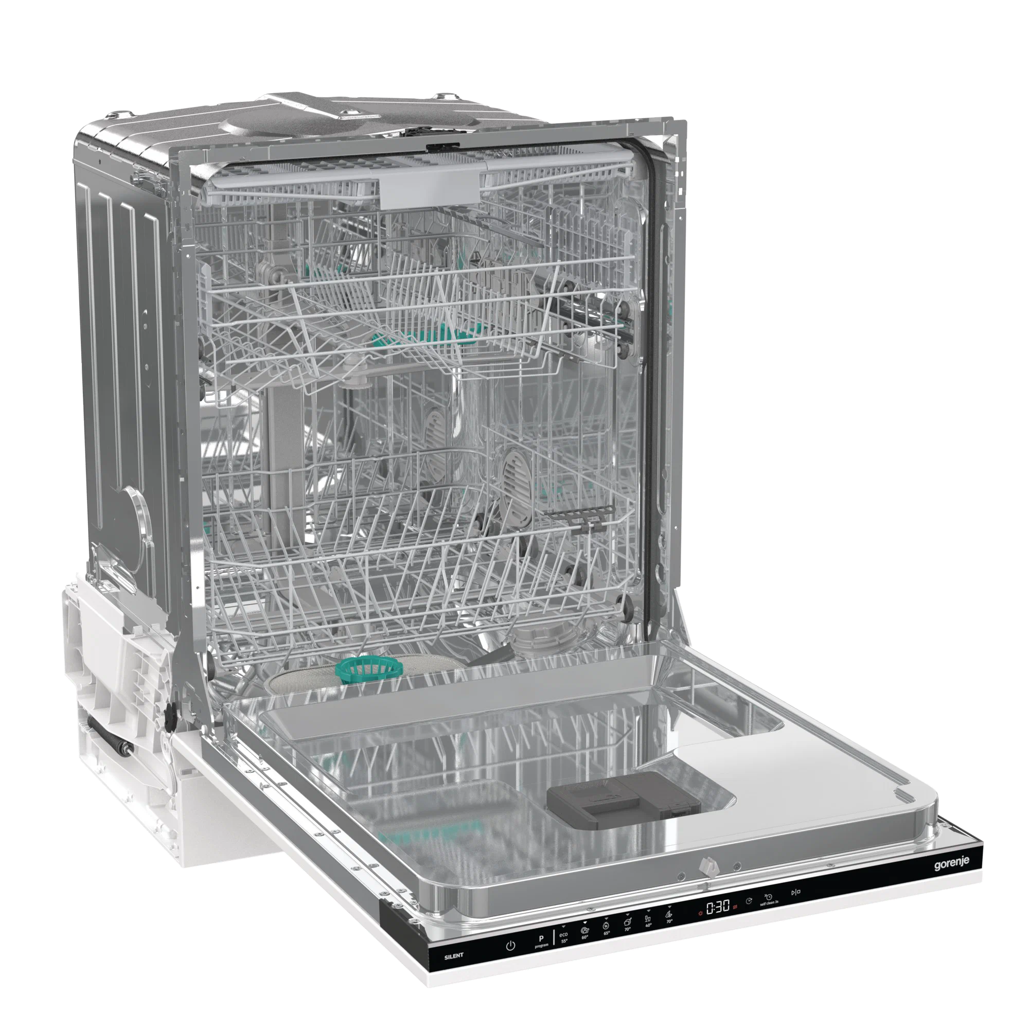 На панели управления расположены дисплей, обозначения со световыми индикаторами и сенсорные кнопки. Звуковой сигнал оповещает о состоянии работы посудомоечной машины Gorenje GV643E90. Запрограммировать нужное время начала мытья посуды позволяет функция отложенного старта. Программа самоочистки способна поддерживать гигиеничную чистоту внутренней камеры. Ионообменник смягчает воду и снижает образование известкового налета. Полная защита от протечек отключает технику в случае обнаружения пролитой воды внутри корпуса или на шланге.