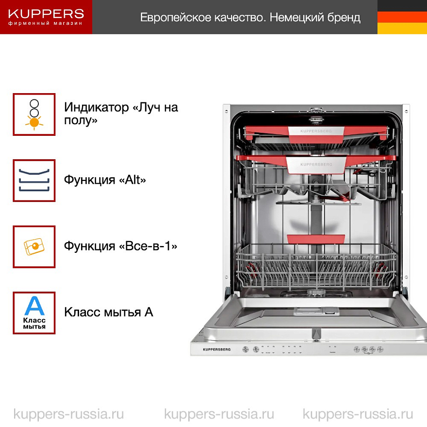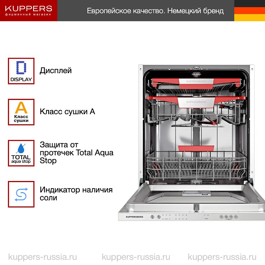 GIM 6092 — топовая полноразмерная модель Kuppersberg (коллекция High-Tech) с инверторным мотором, очень тихой работой, «лучом на полу», автооткрытием двери, режимами PowerWash / TurboSpeed+ и третьей корзиной для посуды.