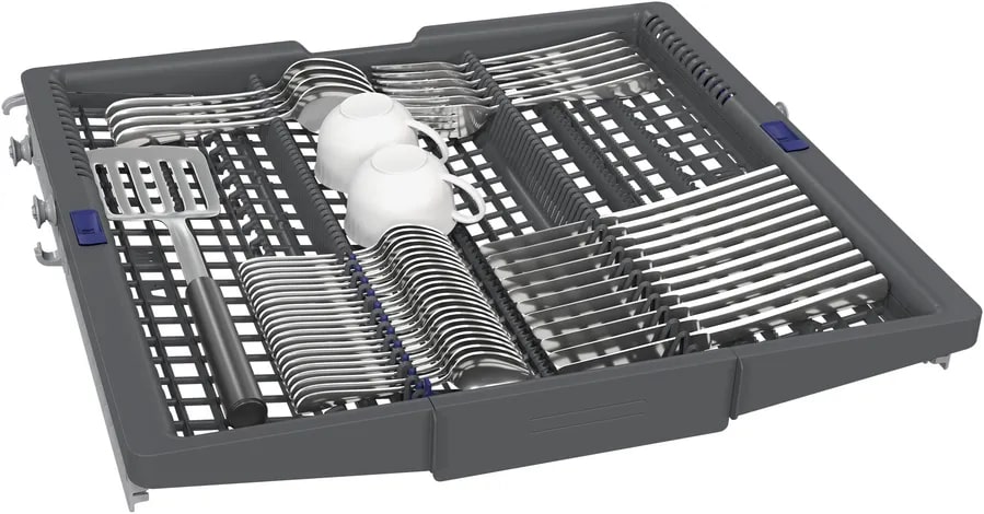 Внутреннее пространство оформлено из нержавеющей стали, что гарантирует устойчивость к коррозии и эстетичный внешний вид спустя годы эксплуатации. Вместимость до 14 комплектов позволяет справляться с крупными загрузками, а две полочки для чашек в каждом ящике и складывающиеся направляющие для тарелок (6/8) в верхнем и нижнем коробах делают размещение посуды гибким. Система vario включает короба varioFlex Pro и Vario3 Pro — практичный лоток для столовых приборов, а верхний ящик rackMatik-3 с возможностью перестановки по высоте и полным выдвижением упрощает укладку высоких предметов и бокалов.