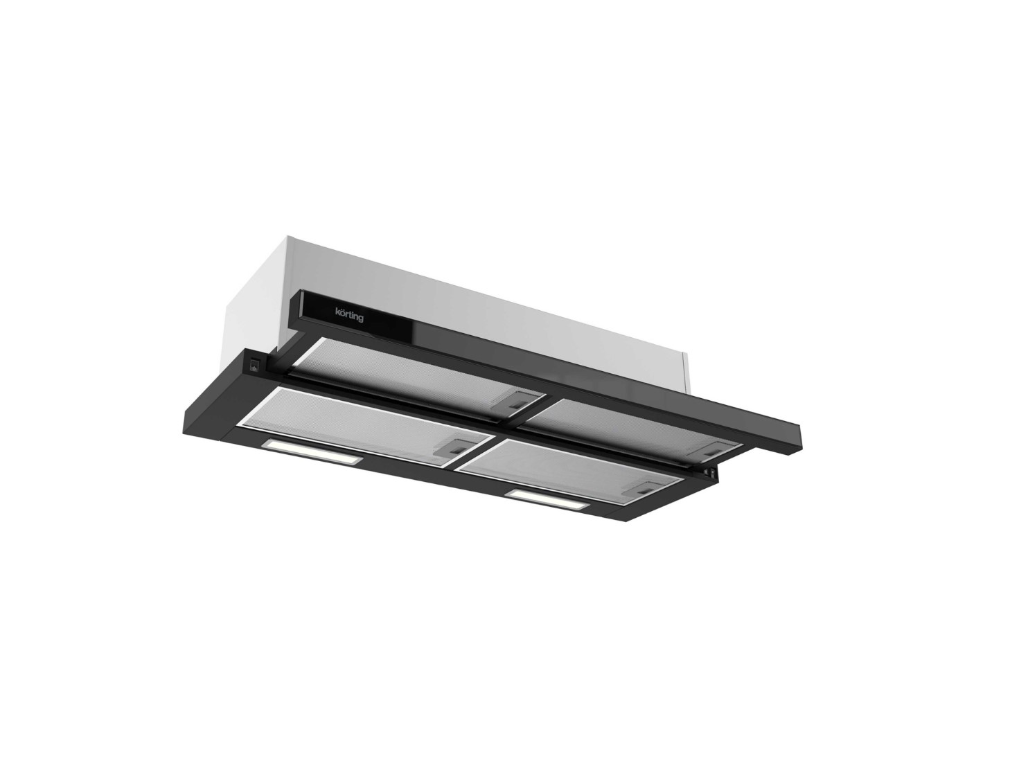 Тип: встраиваемая вытяжка с выдвижным экраном, монтаж в подвесной шкаф 90 см, фасад — черное стекло + сталь.