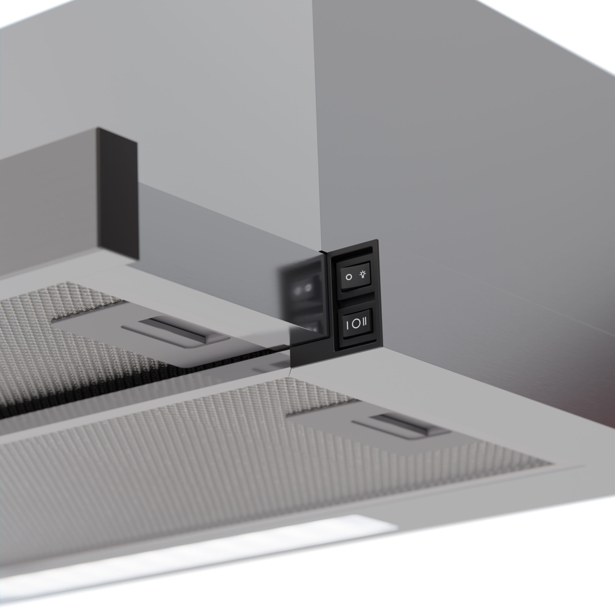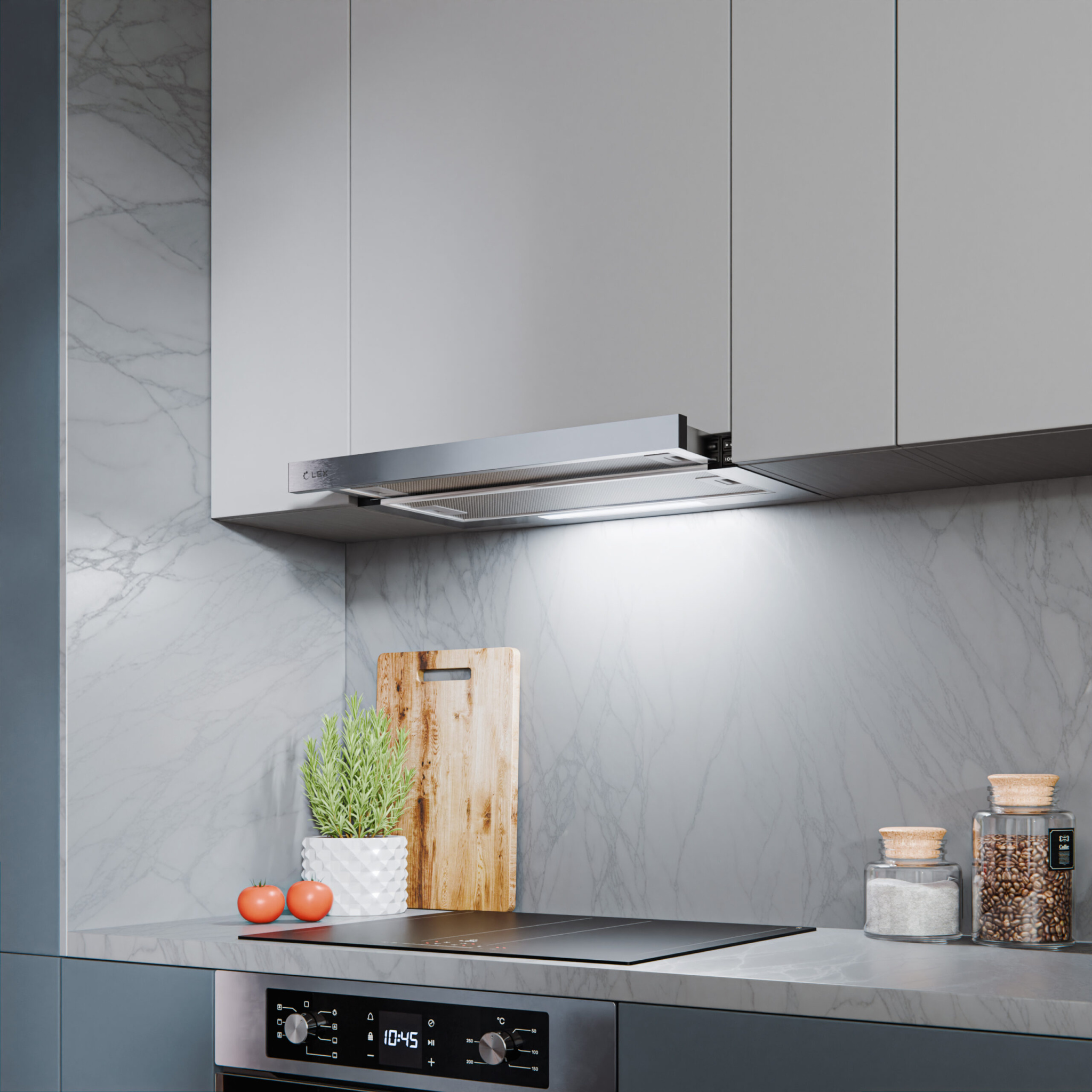 Встраиваемая вытяжка Hermes 600 с инверторным двигателем легко и без лишнего шума справится даже с интенсивным запахом и дымом в большой кухне. Модель имеет две скорости работы, которые удобно переключать на клавишной панели управления. Комфортная подсветка зоны над плитой позволит готовить без дополнительного освещения, что особенно удобно для квартир с европланировкой. Вытяжка может работать в режиме рециркуляции, поэтому ее можно использовать и в кухне без вентиляционного выхода. Телескопическая конструкция дает возможность сэкономить место без потери производительности. Модель встраивается в кухонный шкафчик, видимой остается только узкая передняя панель, поэтому вытяжку можно установить в любую кухню, независимо от стиля интерьера.