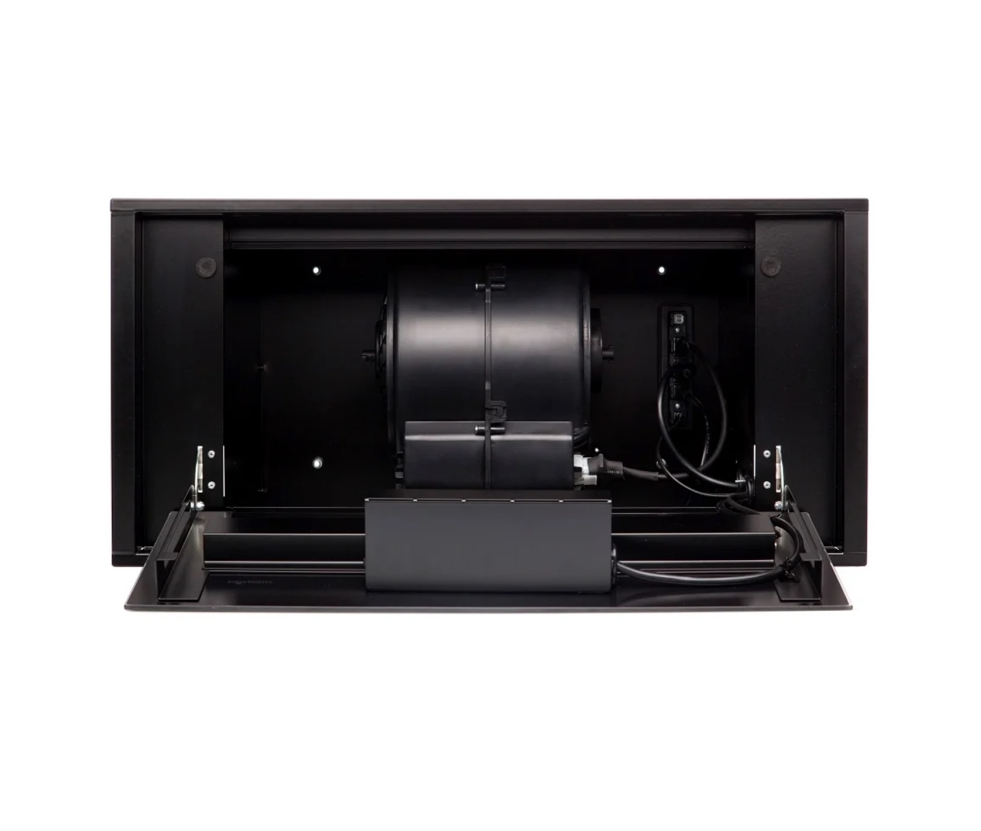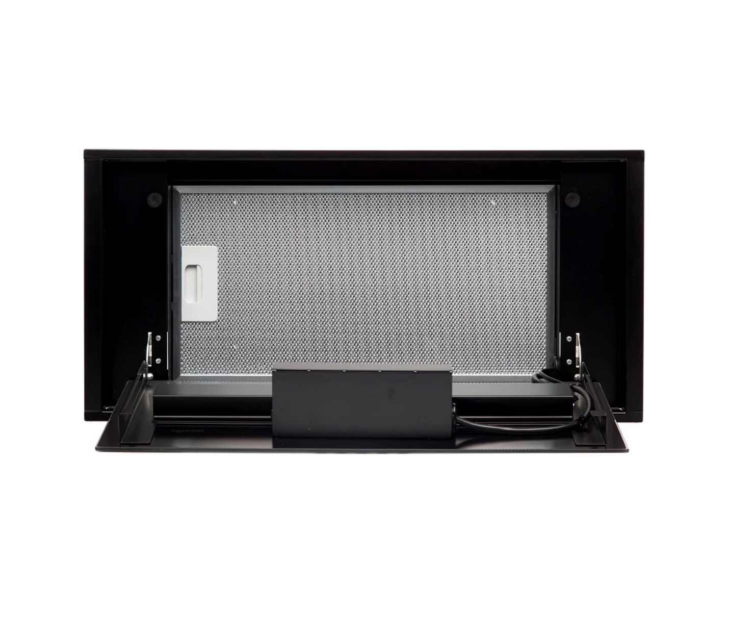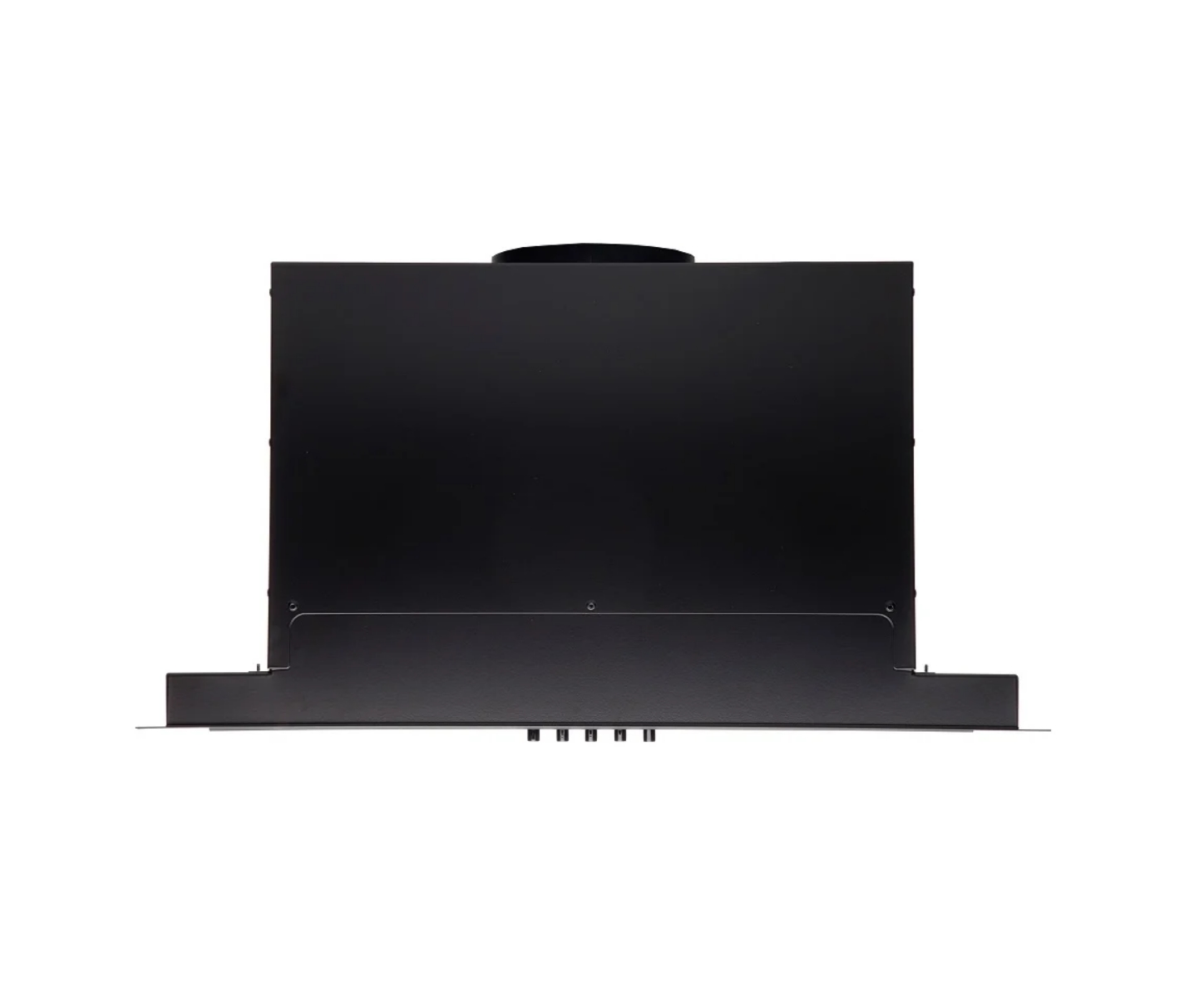 Вытяжка полностью закрывает нижний горизонт шкафчика и может монтироваться вместо нижней полки.