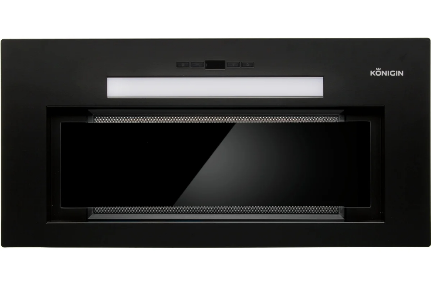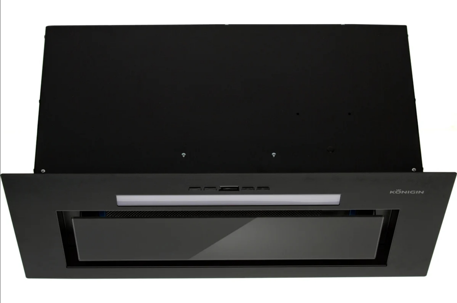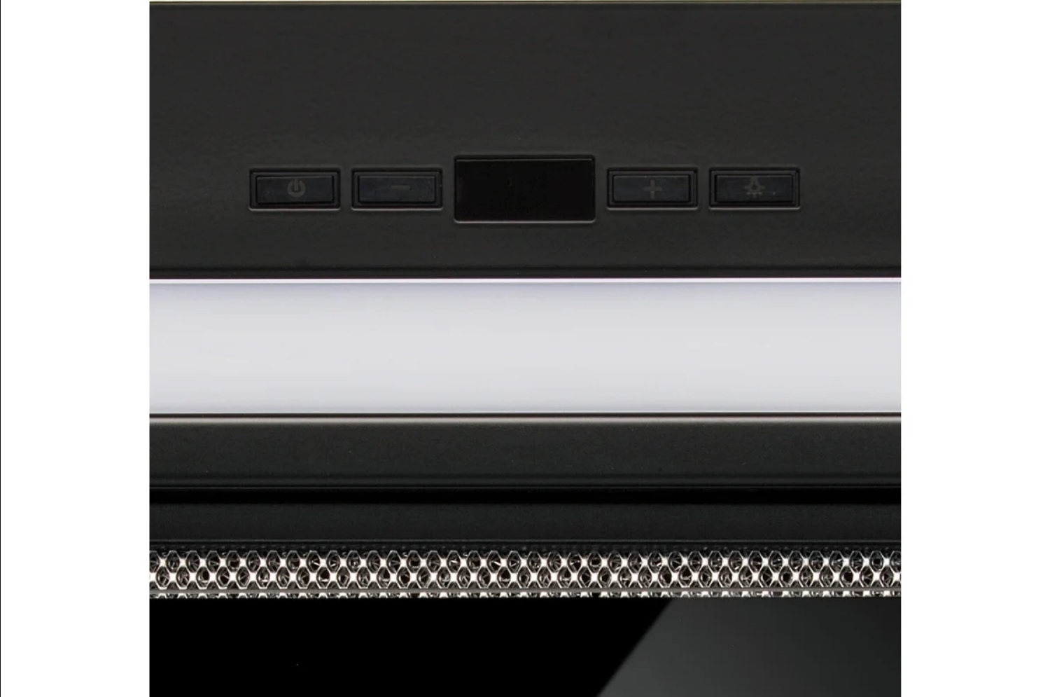 Фасад вытяжки полностью закрывает нижнюю полку – это позволяет монтировать вытяжку в кухонные шкафчики вместо нижней полки (дна). Удобная система монтажа.