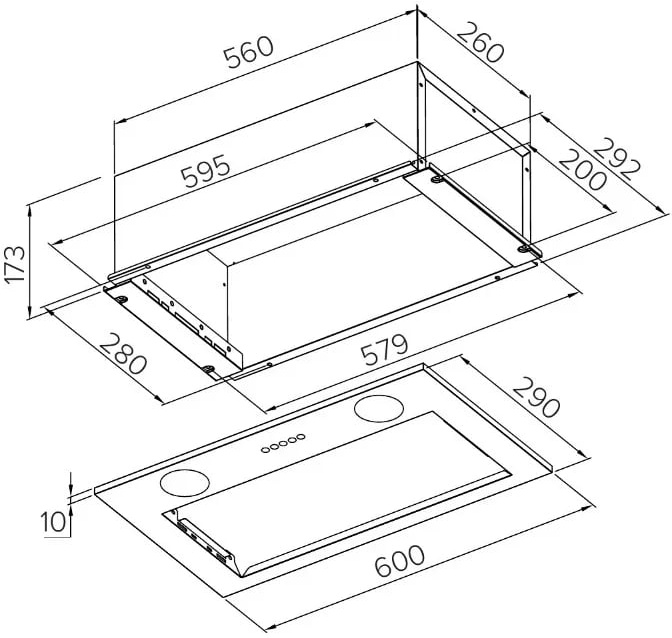 Компактные размеры (ширина 600 мм, высота 173 мм, глубина 290 мм) позволяют легко встроить вытяжку в кухонный гарнитур, сохраняя пространство и стиль.